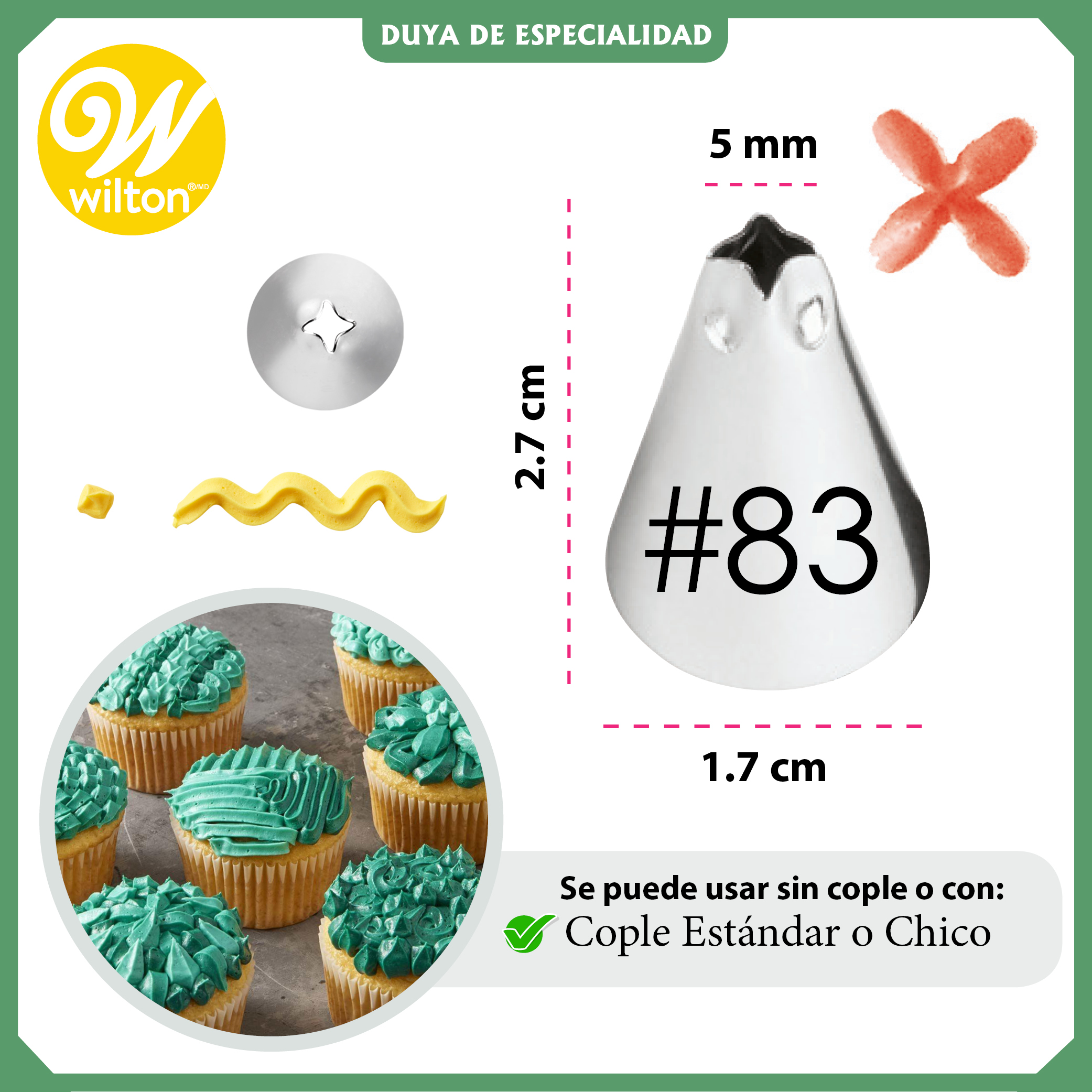 La Duya Número 83 de la marca Wilton es una herramienta esencial para cualquier amante de la repostería que busca perfeccionar sus técnicas de decoración. Con un diámetro de base de 1.7 cm, esta boquilla redonda permite crear detalles precisos y acabados profesionales en pasteles, cupcakes y galletas. Su diseño especializado facilita la aplicación de glaseados y cremas, brindando versatilidad en cada uso.