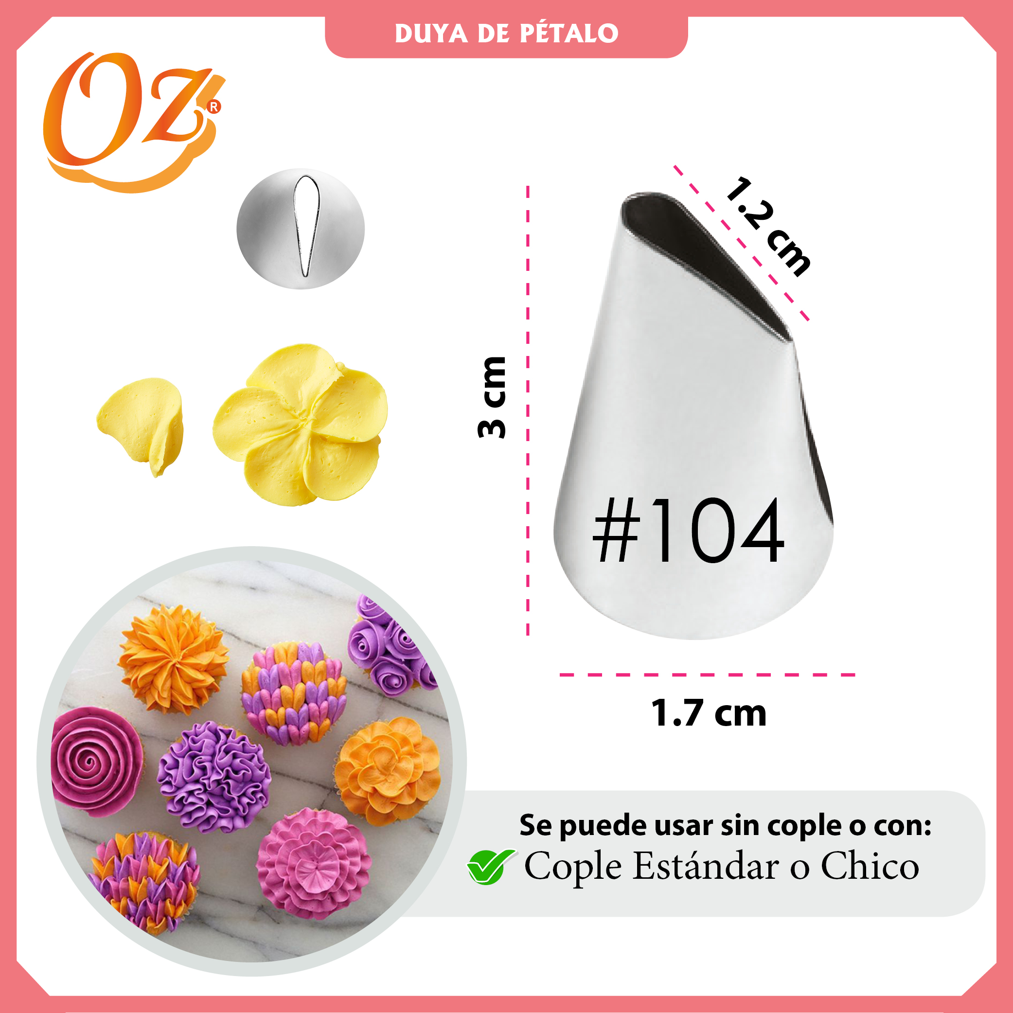 Fabricada con acero inoxidable de alta calidad, garantiza durabilidad y un acabado impecable en cada uso. Con un diámetro de base de 1.7 cm, es fácil de manejar y se adapta a diversas mangas pasteleras. Su diseño innovador permite que los reposteros de todos los niveles puedan expresar su creatividad sin límites. Ideal para ocasiones especiales o para dar un toque profesional a tus postres caseros, esta boquilla es un imprescindible en la cocina de cualquier amante de la repostería. ¡Echa a volar tu imaginación y sorprende a todos con tus creaciones!